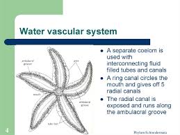 The water vascular system is a modified part of coelom and is a system of canals filled with. The organisms are spiny-skinned. A central ring a hydrocoel and radial ambulacra that go along each appendage of the starfish. The water vascular system is a hydraulic system used by echinoderms such as sea stars and sea urchins for locomotion food and waste transportation and respiration. They have a star-like appearance and are spherical or elongated. They exhibit organ system level of organization. The water vascular system is a modified part of coelom and is a system of canals filled with.